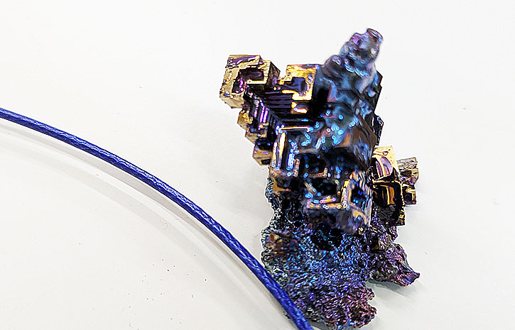 結晶は和名の蒼鉛(そうえん)の名前の通り蒼みのある不思議な色と金属光沢がある大変美しいものです。