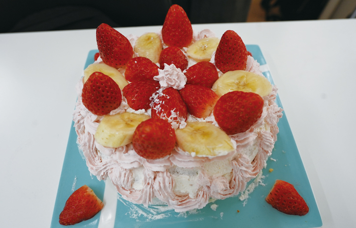 イチゴに目もくれず、パイナップルの缶詰を最初に確保したので、いったいどんなケーキになるのだろうかとみんな興味津津でしたが、こうなりました。
