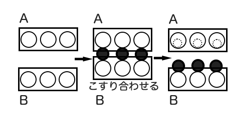 2つの物をこすり合わせると、電子が動きやすい方から、動きにくい方へ移動します。図ではAから離れた電子がBへ移動しマイナスの電気をおびて、電子を失ったAはプラスになります。